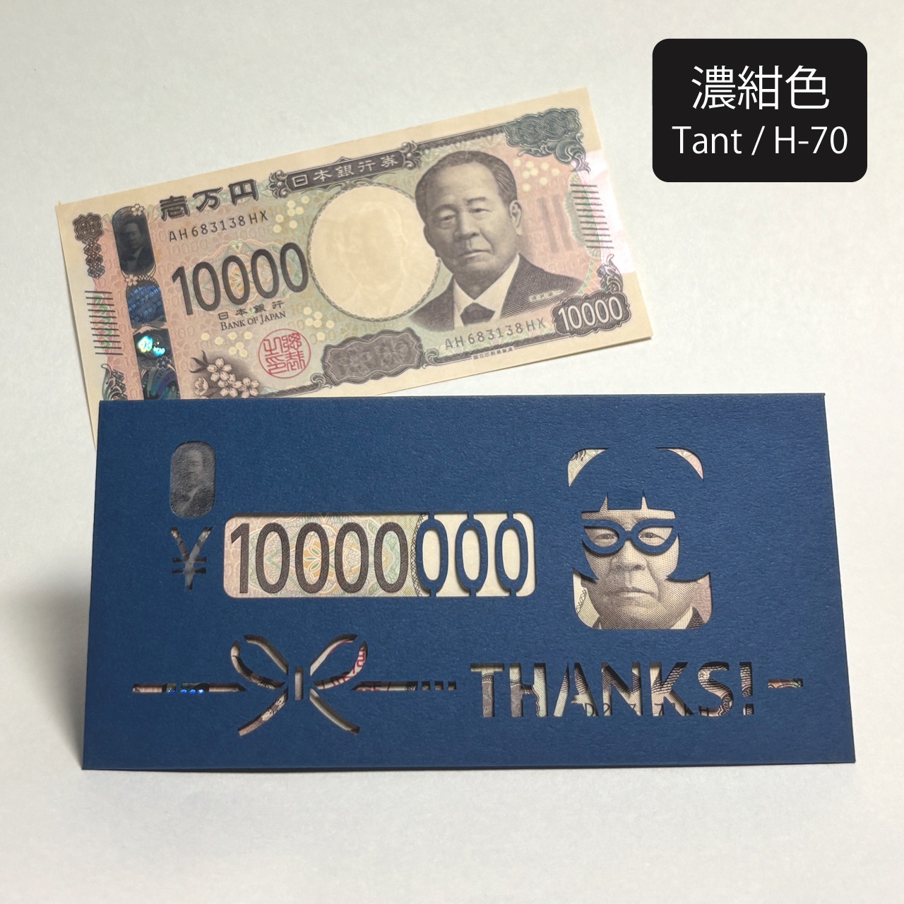 お札に描かれた著名人が仮装するユニークなデザインで、切り絵で「お札を入れると増額した⁈」ような切り絵デザインが特徴。