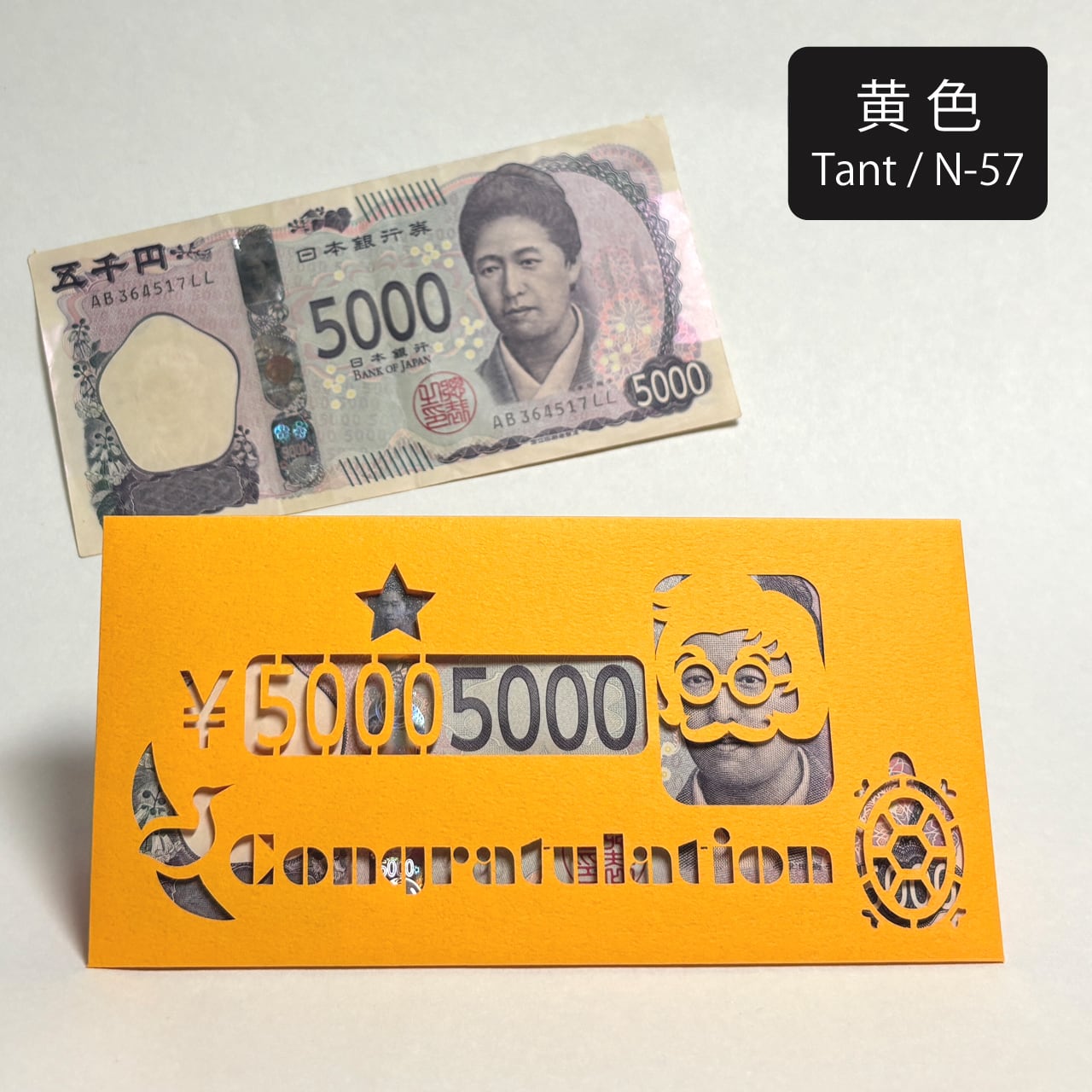 お札に描かれた著名人が仮装するユニークなデザインで、切り絵で「お札を入れると増額した⁈」ような切り絵デザインが特徴。