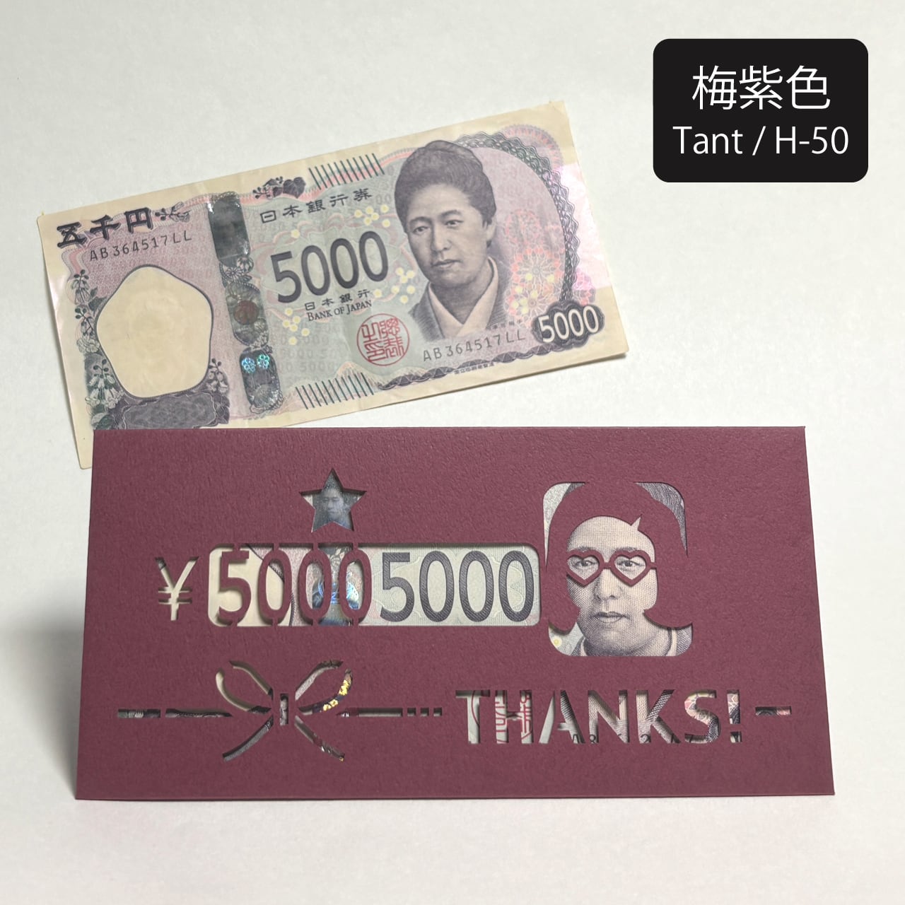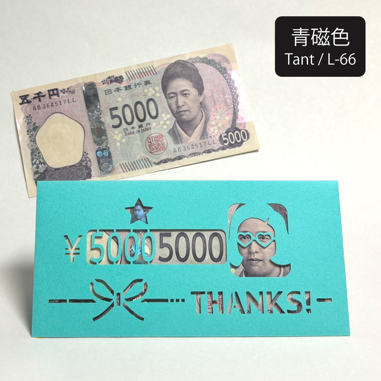 お札に描かれた著名人が仮装するユニークなデザインで、切り絵で「お札を入れると増額した⁈」ような切り絵デザインが特徴。