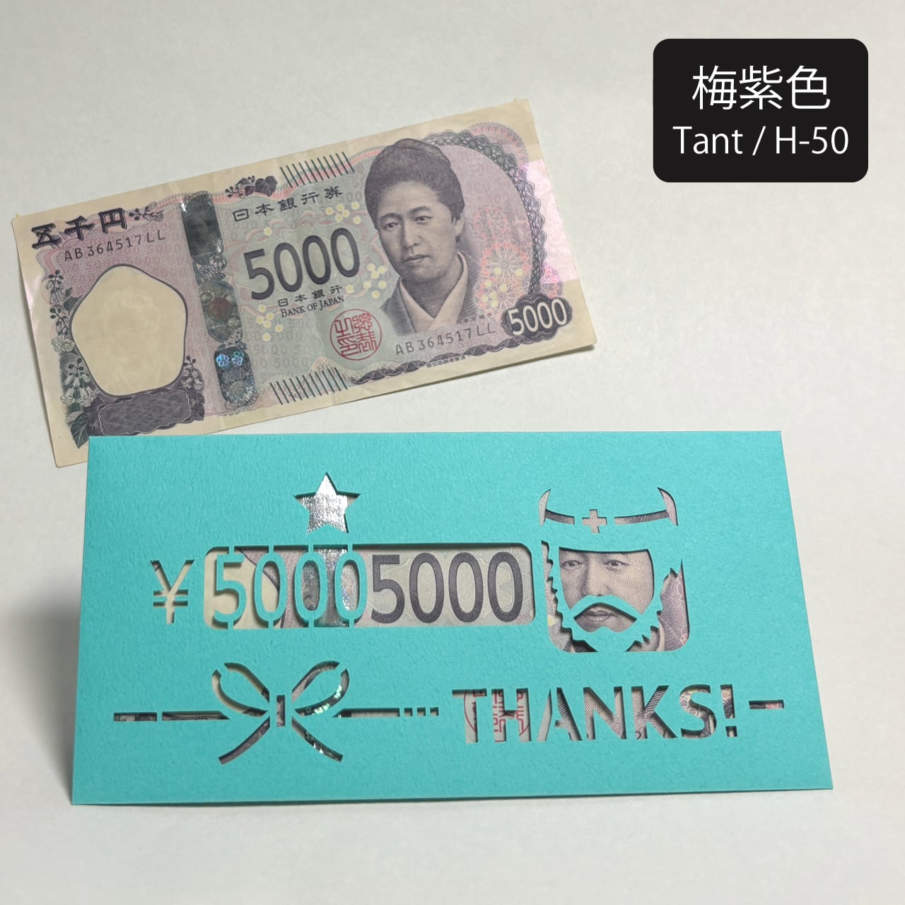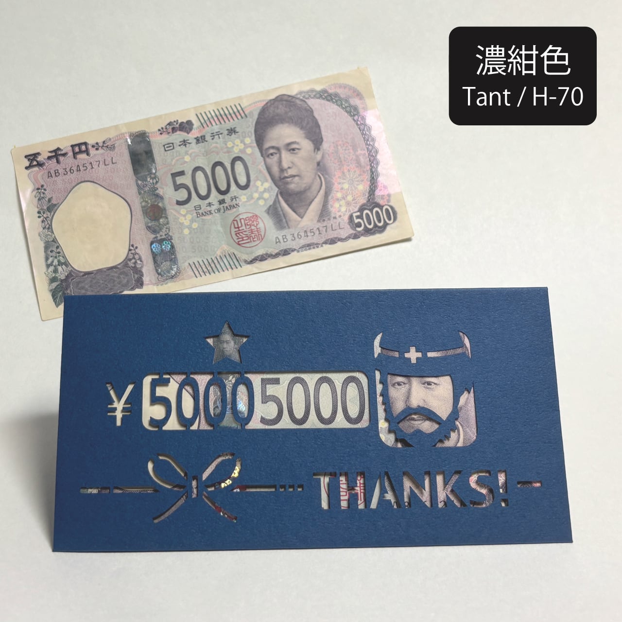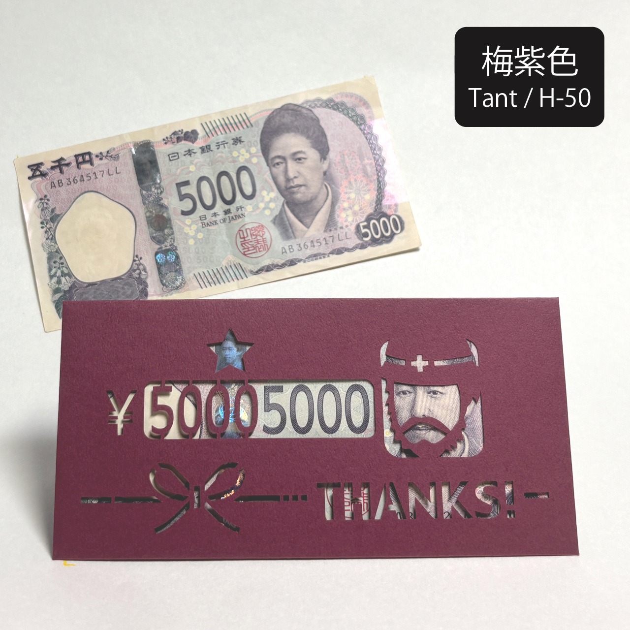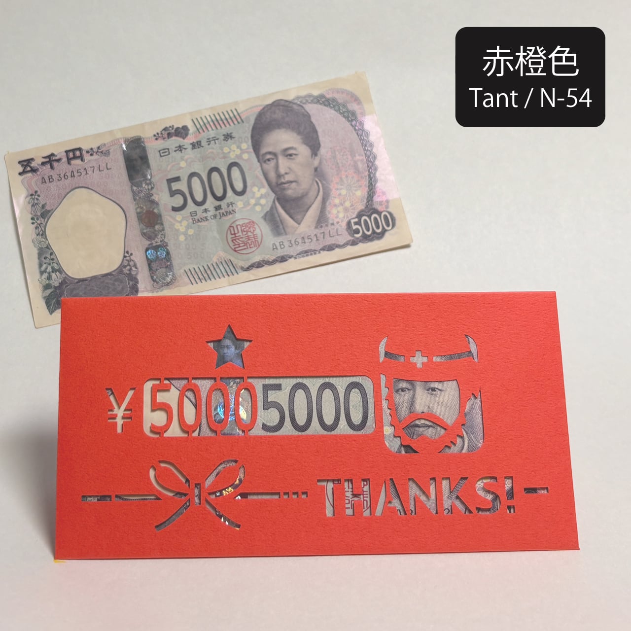 お札に描かれた著名人が仮装するユニークなデザインで、切り絵で「お札を入れると増額した⁈」ような切り絵デザインが特徴。