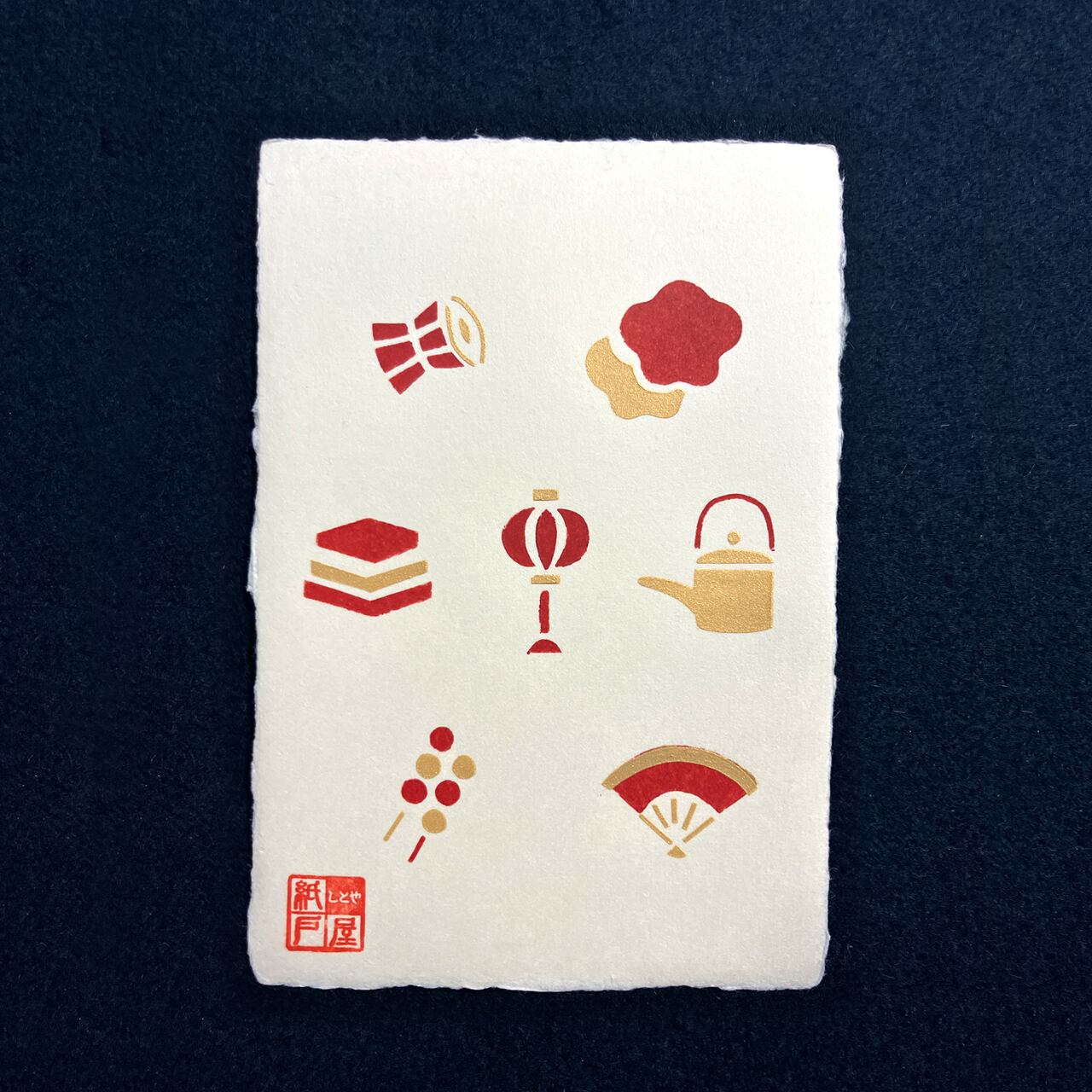 手づくりの温もりが感じられる、四季の手刷りハガキ。越前手漉きハガキを使用し、季節感を表現したさまざまなデザインが特徴です。色胡粉や金パール、雲母、墨などの天然画材を用いて、一枚一枚丁寧に手刷りで仕上げています。