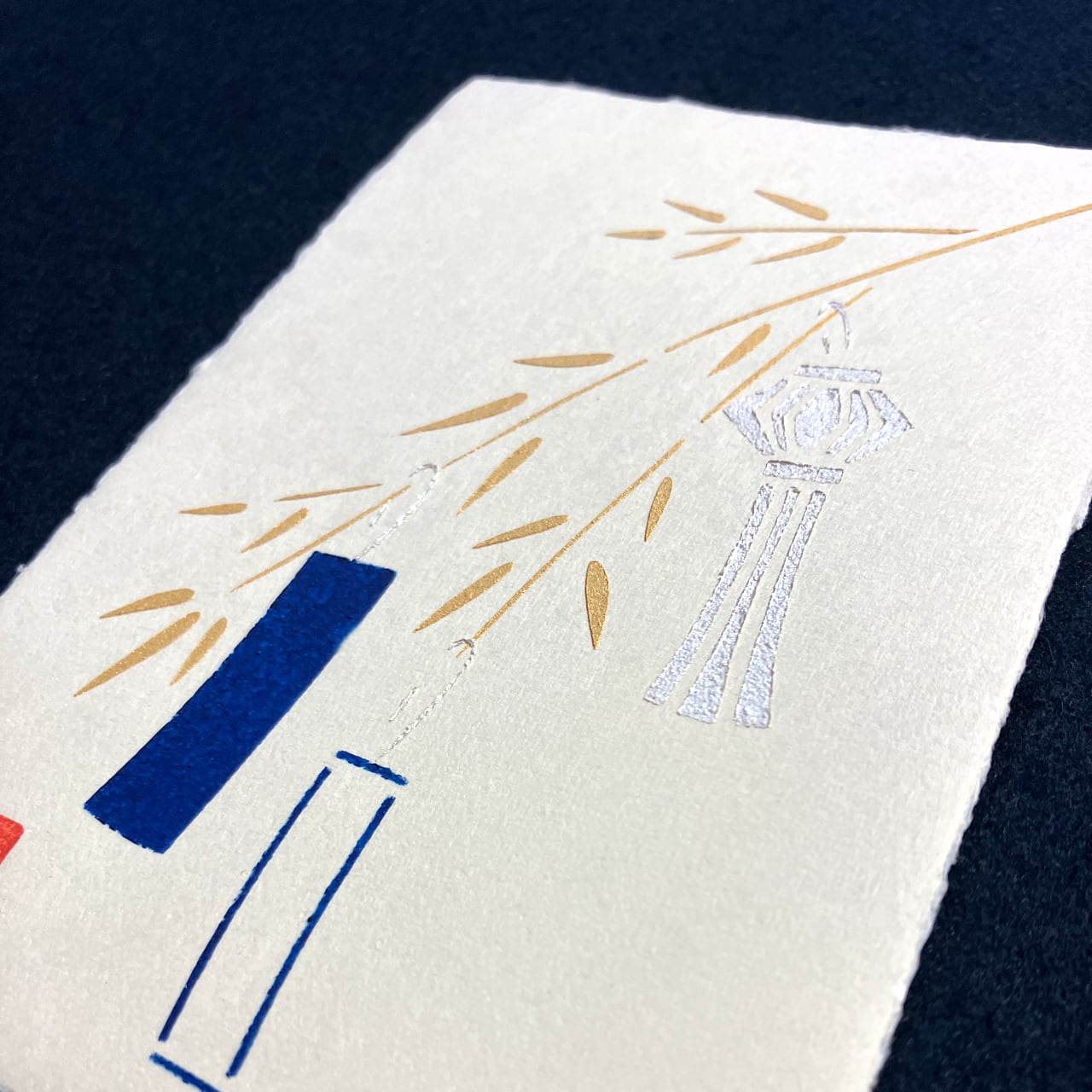 手づくりの温もりが感じられる、四季の手刷りハガキ。越前手漉きハガキを使用し、季節感を表現したさまざまなデザインが特徴です。色胡粉や金パール、雲母、墨などの天然画材を用いて、一枚一枚丁寧に手刷りで仕上げています。