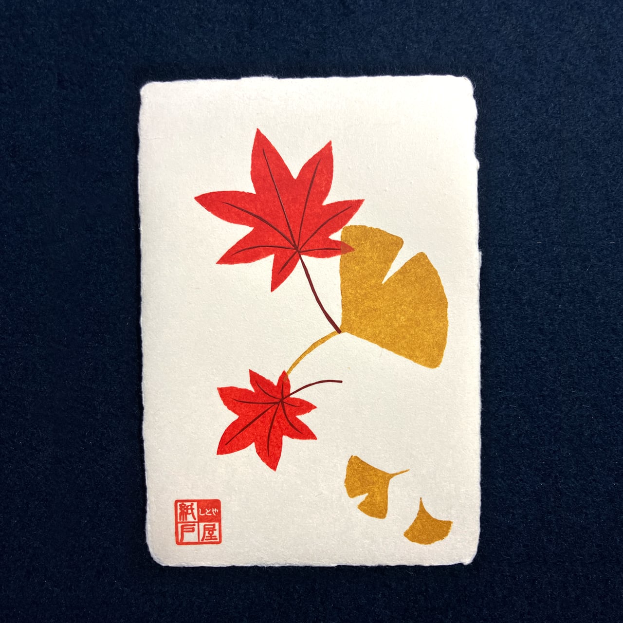 手づくりの温もりが感じられる、四季の手刷りハガキ。越前手漉きハガキを使用し、季節感を表現したさまざまなデザインが特徴です。色胡粉や金パール、雲母、墨などの天然画材を用いて、一枚一枚丁寧に手刷りで仕上げています。