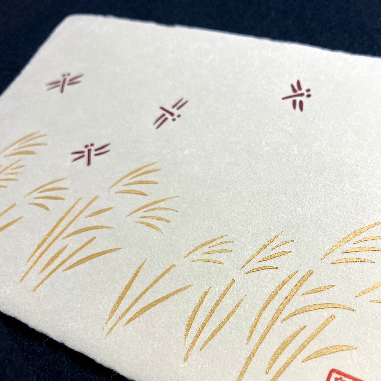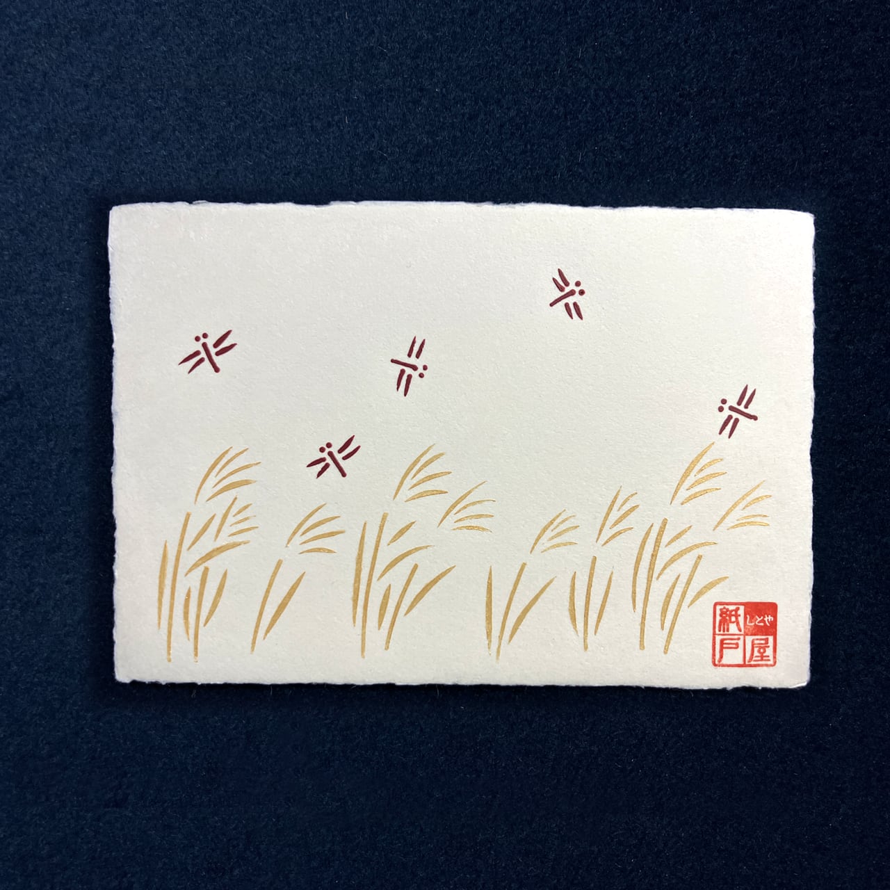 手づくりの温もりが感じられる、四季の手刷りハガキ。越前手漉きハガキを使用し、季節感を表現したさまざまなデザインが特徴です。色胡粉や金パール、雲母、墨などの天然画材を用いて、一枚一枚丁寧に手刷りで仕上げています。