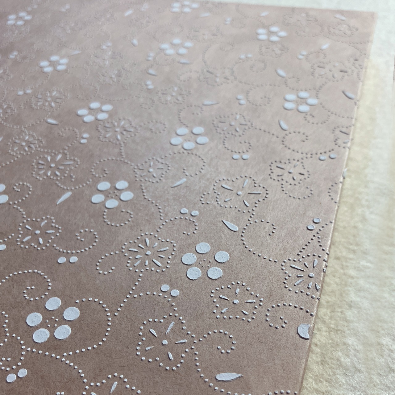 手づくりの美しさが際立つ、伊勢型紙パネル(牡丹唐草)。当店オリジナル「町家ふすま」に使用する伊勢型紙を使用し、越前手漉き和紙に「置き上げ」という技法でつけられた胡粉や色胡粉が、華やかなデザインを引き立てています。竹釘を使ってつくられた襖骨に下張りをして作成しているので、軽量で和紙の風合いを感じられるパネルです。伝統の技が息づく伊勢型紙・和紙パネルをぜひお楽しみください。