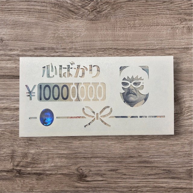 がんばる自分へ贈る、ちょっと特別な金封。 がんばる理由は、人それぞれ。 貯金、投資、仕事、夢… その一歩を後押しする、小さなスイッチとして。 お札を入れると、“1千万円”に見える遊び心。 だけど込める想いは、本気です。 今日はまだ途中でもいい。 でも、きっとその先へ。 めざせ!1000万円・ガンバレ!オレ! 自分自身へのエールとして。 大切なあの人へ、ちょっと粋な贈り物として。 ■ 顔 ・丸めがね ■ カラー/サイズ ・カラー:極薄茶色 *紙取りの場所により、入る柄が異なります。 ・サイズ:約H78mm×W162mm ■ 素材/製造国 ・素材:紙(ふすま紙・新鳥の子) ・製造国:日本 ■ お手入れ/取り扱い注意事項 ・直射日光を避け、湿気の少ない場所での保管をお勧めします。 ・切り絵部分は非常に細かくデリケートです。取り扱いにはお気を付け下さい。 ■ 発送・注文に関する情報や注意事項 ・送料サイズ:クリックポスト(日本全国一律:185円) *あまりにも枚数が多くなった場合は、佐川急便での配送となります。 ・発送は通常7日以内に行います。 ・在庫状況やご注文枚数によっては、発送が遅れる場合がございます。ご了承ください。 ■ その他の情報や注意事項 ・商品に紙幣は含まれません。 ・手作り商品ですので、仕上がりに多少個体差がございます。 ・紙幣は10枚程度入ります。 === Attention ==== PCやスマホ画面では、実際の色目と異なる事があります。 ご了承の上、ご購入下さい。 === Attention ====
